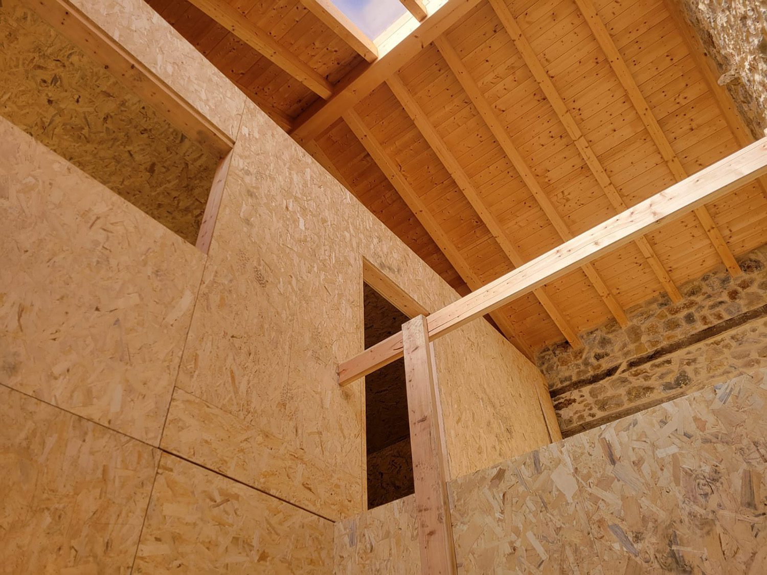 Dentro de los muros de piedra se introduce una caja de entramado ligero de madera, que configura la envolvente térmica y hermética del edificio. Esta nueva caja se apoya en las fachadas norte, oeste y sur, mientras que al este queda un espacio intersticial, iluminado cenitalmente y concebido como un patio cubierto. Este espacio intermedio actúa como zona de transición entre interior y exterior, además de funcionar como amortiguador térmico frente al clima local.